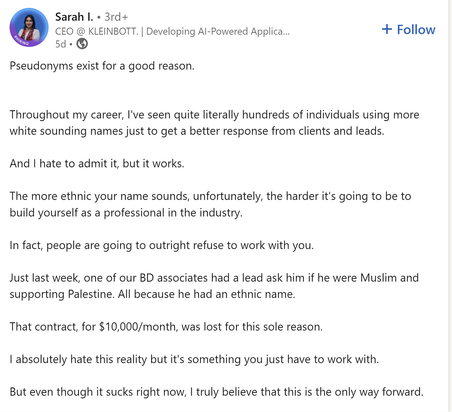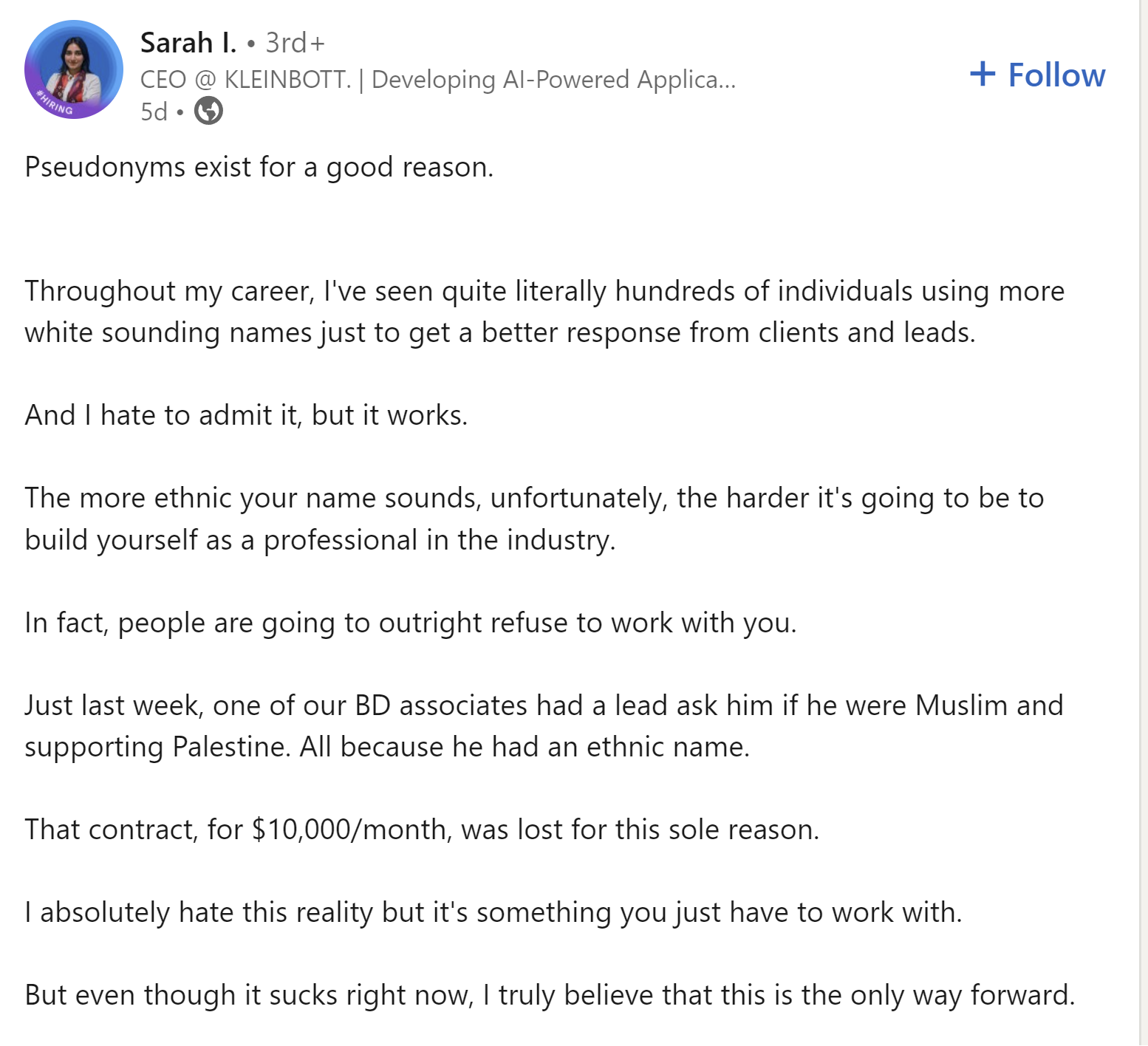 So of course a smart person of ethnic origin is going to disguise their name. You are trying to fit through a processing laser designed to figure out how much you stick out.