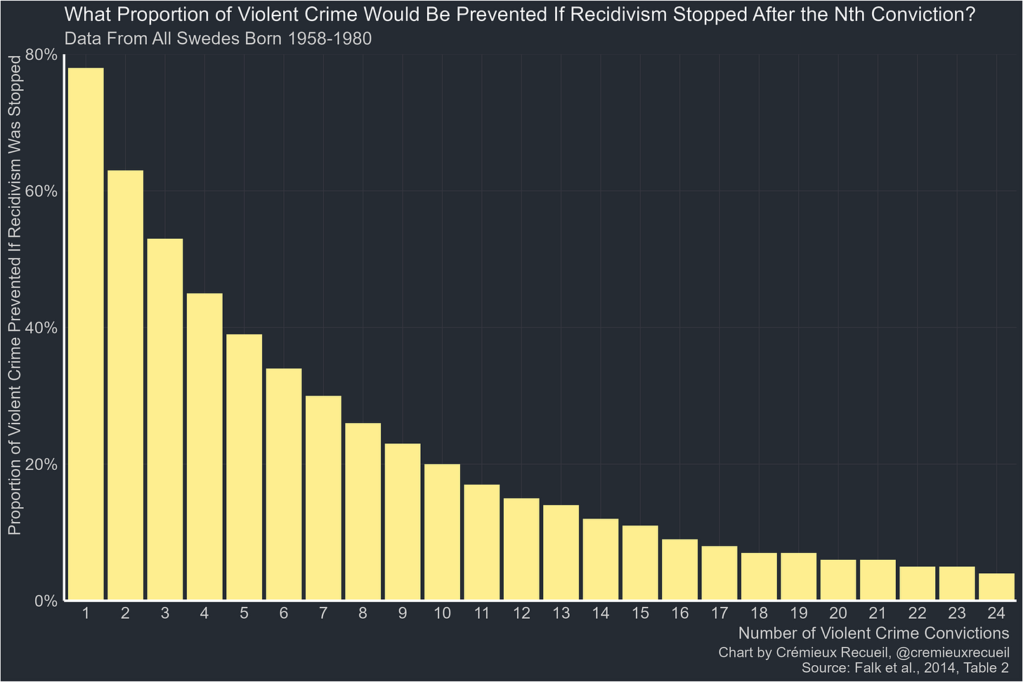 If you add up all the percentages on the chart below, you will find that you can prevent 553% of violent crime by simply never letting criminals out of jail, ever.
