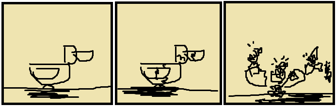 Duck number three paints fun patterns on the egg, using one of his own plucked feathers as a paint brush. He’ll replace this brush after each egg is finished, meaning its color will be whatever color the previous egg was, not the current egg. He then paints fun designs on it like stripes or squiggles, and drops it to Duck#4, who avoids hitting it with his chisel.