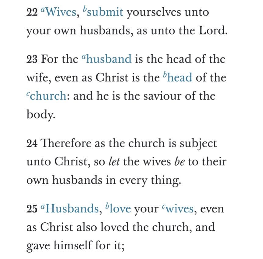 Women have been told by academic feminism for decades that traditional marriage is mostly a vehicle for men to abuse them. I’ve seen enough cases of abusive men to know this is absolutely a legitimate concern, far more than many of my manosphere friends give it credit for, but I also know… like quite a few non-abusive men. Like if you gave him comical tyrant levels of enslavement power over his wife , nearly every guy I know would still be nice to his her5. However I believe even if you could magically guarantee a husband would be perfectly non abusive, or even perfectly righteous, most women would still have a huge problem with the idea of “submitting” to him. This plays out immediately within the first 10 pages of the entire Book of Mormon6.